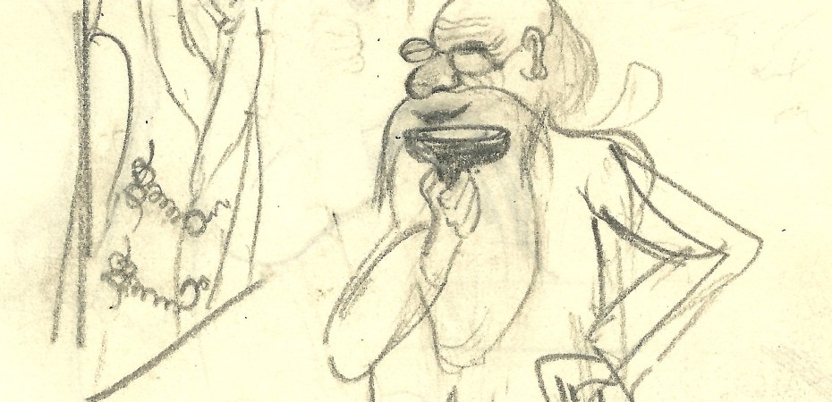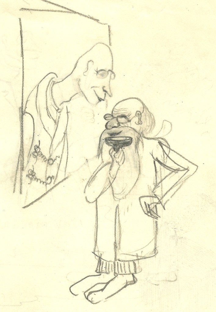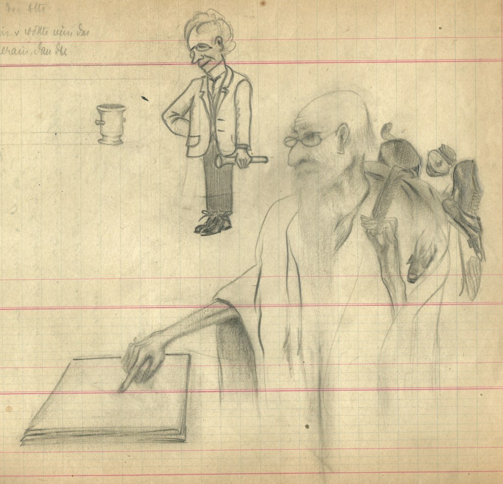 Und was ist das jetzt? Da steht wieder unser Apotheker mit einem Stössel in der Hand und neben ihm der Mörser in einer klassischen Form. Das Blatt aber wird beherrscht von der Figur eines hageren Glatzköpfigen in einem Umhang. Die wenigen übriggebliebenen Haare stehen ab wie Kükenfedern, unter der großen Nase ein weißer Rauschebart. Mit dem rechten Zeigefinger zeigt er in die Mitte eines Blattes oder Bogen Papiers, in der linken Hand hält er eine Feder an seine Schulter, an der andere Utensilien versammelt sind: Ein Damenschuh (Willis Lieblingsschuhe, wie viele andere Frauenbilder zeigen und mich an die Ausstattung der Damen in einem klassischen Western-Saloon erinnern; oder – Willis Phantasien wahrscheinlich näher: Im Pigalle in Paris) und eine Art Fuchsfell, die anderen Gegenstände kann ich nicht entziffern. Das könnte eine Variante des Apothekers sein oder aber auch ein Bruder des Dürren mit dem Riesenschneuztuch. Wer hat sich hier verwandelt? In was hat er sich verwandelt? Ein Eremit, der in die Geschichte hineingewandelt ist und mit dem Finger auf etwas zeigt, dass wir lesen oder verstehen sollen? Ein asiatischer Zauberer, der uns einen Apotheker-Trank mischen will mit den rätselhaften Ingredienzen, die er über der Schulter hat?