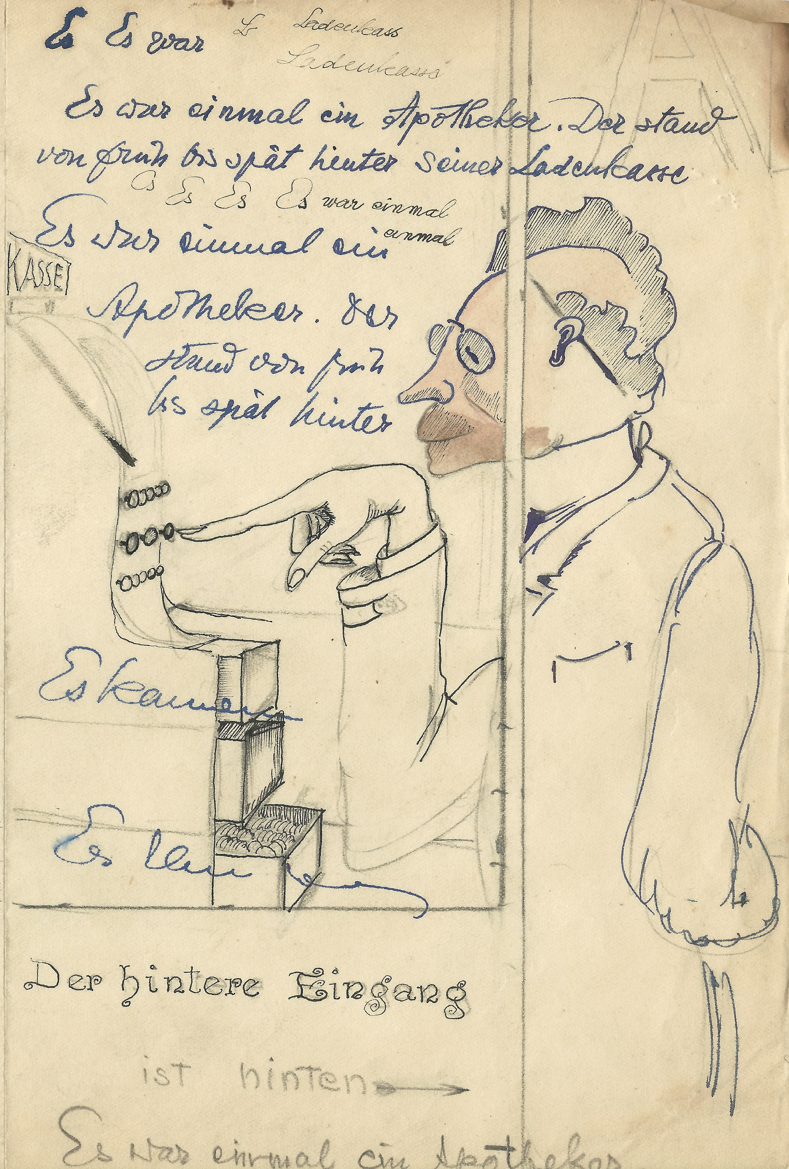 Der Text lautet: „Es war einmal ein Apotheker. Der stand von früh bis spät hinter seiner Ladenkasse.“ Unten am Bildrand sieht man das Schild an der Türe, das bestätigt: „Der hintere Eingang ist hinten —>“