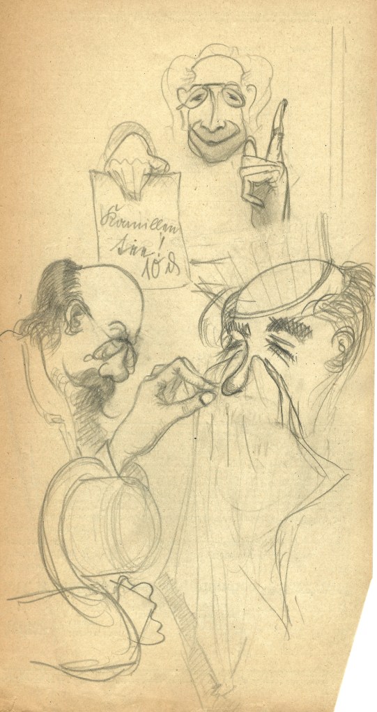 Hier links haben wir allerdings eine Variante, die dem Text entsprechen könnte: Der Apotheker, eher im Morgenmantel als im weißen Kittel (wie er vorhin an der Kasse zu sehen war), beugt sich aus dem Fensterchen zu einem kleinen Kerlchen mit ziemlicher Glatze und Rauschebart und hat ihm wohl ein Gläschen vom „Bitteren“ gereicht. In der Mitte haben wir wieder die 3 Gestalten von vorhin und der, der dem Schnupfenden beiseite gestanden war, steht nun da und zupft mit spitzem Finger am Schneuztuch, während er für die bessere Sicht über den Brillenrand lugt. Der Apotheker wirbt jetzt für Kamillentee, hält allerdings mit erhobenen Zeigefinger das Preisschildchen hoch anstatt eine dampfende Tasse Tee zu reichen. Und rechts dann eine Variation auf den Apotheker am Mörser, wie auch auf dem linken Bild von einem schrulligen Knauser verwandelt in eine fast entmenschlichte Gestalt. Man stellt ihn sich vor mit fahler Haut, im Gesicht und auch auf der glattpolierten Glatze.