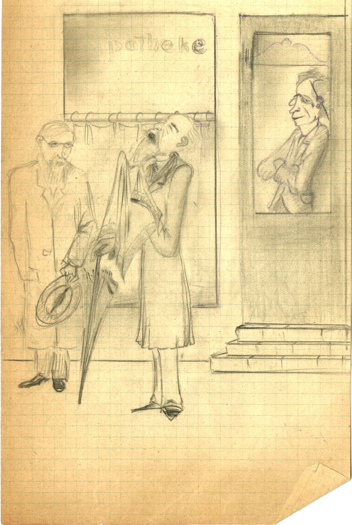 In einer anderen Skizze des Apothekers an seiner Türe sieht man Werbung in seinem Schaufenster für „Pilulae Zwetschkensis“, kleine, gut versteckte Feinheiten.