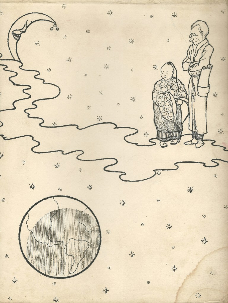 Aber da ist er ja nochmal, unser Apotheker, und steht auf der Milchstraße, die im Hintergrund zum Mond führt. Neben ihm ein Chinese, der so kurz und dick ist wie der Apotheker lang und dürr. In seiner Kitteltasche ist ein großer Plan zusammengerollt und der klassisch gekleidete Chinese mit dem straff gebundenen, ellenlangen Zopf blickt mit ihm gemeinsam auf die weit entfernte Erde, die bis auf eine schmale Sichel im Schatten der Sonne liegt. Nachdenklich stehen sie beide da, der Apotheker hat mit frierend hochgezogenen Schultern und verschränkten Armen den Blick nachdenklich gesenkt. Kein Happy End, so einsam weit entfernt von allem im Weltall gestrandet. Keine zauberhafte Szene aus Peterchens Mondfahrt, aber immerhin den schnaubenden alten Herren und der Registrierkasse entronnen.