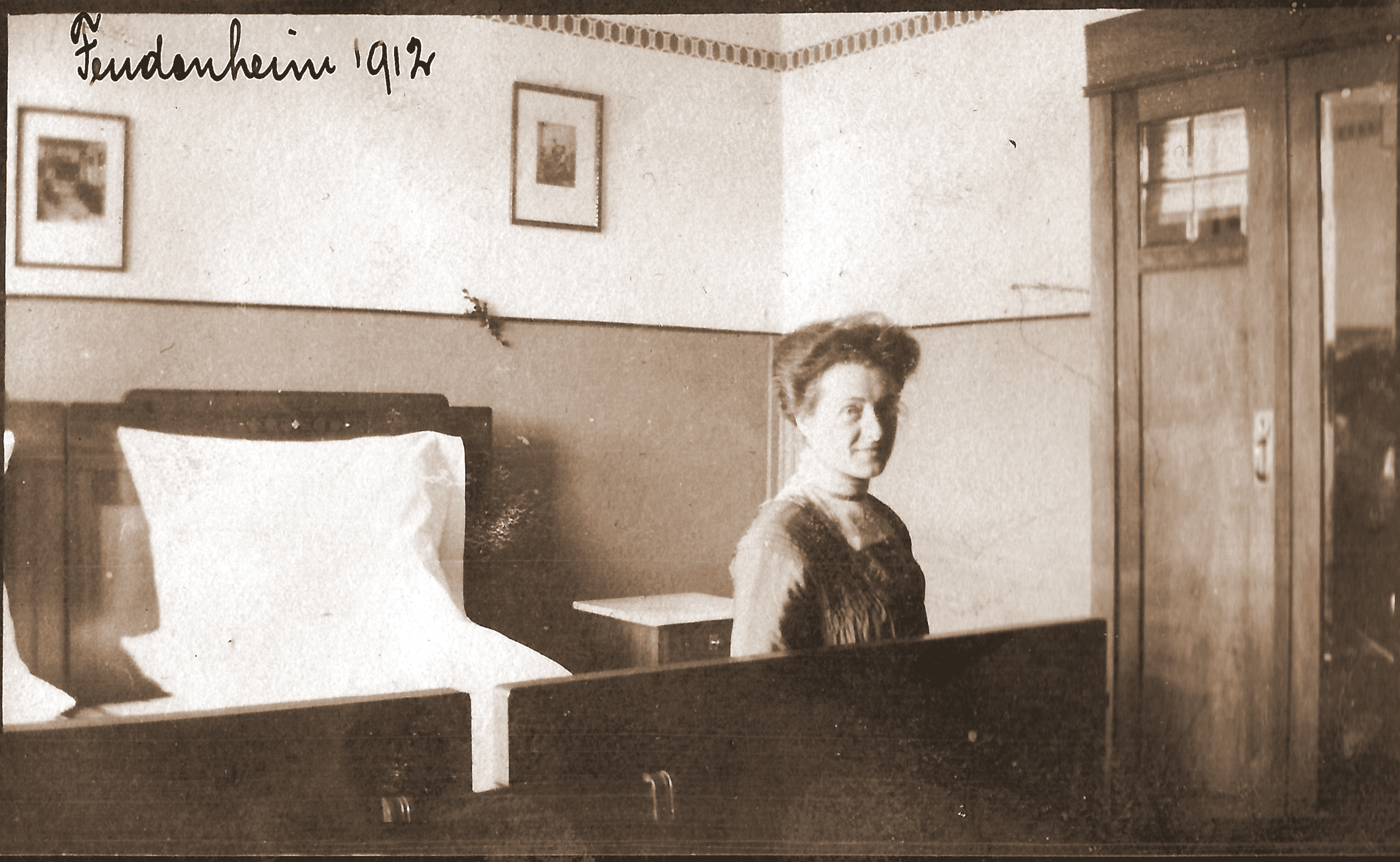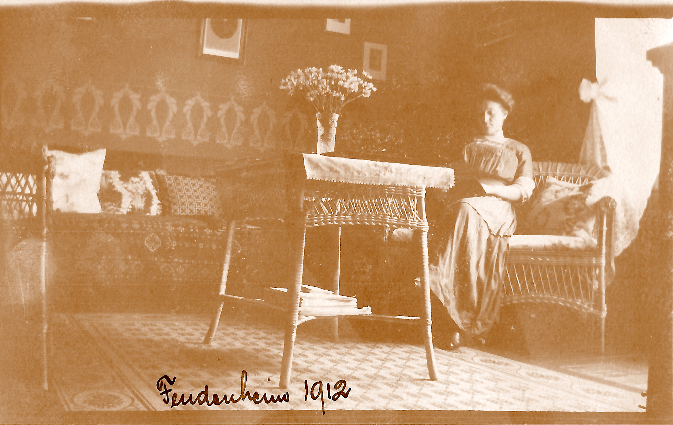 Aus dem Jahr 1912 gibt es Fotos, die Augusts und Mathildes Zuhause in Mannheim-Feudenheim zeigen. Oben links sitzt Mathilde im neueingerichteten Schlafzimmer, der Kleiderschrank am Bildrand ist mit Liselotte nach Miltenberg gewandert, wo sie später als Lehrerin gelebt hat. Dort haben wir ihn nach ihrem Tod aus ihrem Abstellraum gerettet und ihn zurück nach Mannheim gebracht, wo er in unserem Zuhause seine Rundreise vollendet hat.