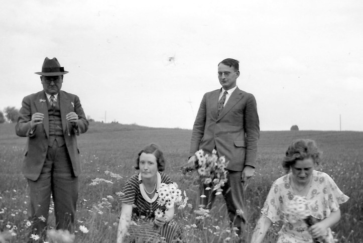 Vor diesem Hintergrund fängt dieses Bild an, vor Absurdität zu schreien. Vorne knien zwei Frauen in der Wiese, die linke ist Liselotte. Sie pflücken Blumen, wie man sich das für kleine deutsche Mädchen in dieser Zeit so vorstellt; nur sind die beiden keine BDM-Mädels, sondern erwachsene Frauen, Liselotte jedenfalls scheint sich dieser Diskrepanz bewusst zu sein, begeistert schaut sie nicht drein. Hinter den beiden Frauen steht Liselottes Cousin Hans, der im September 1942 „im Osten den Heldentod für sein geliebtes Vaterland“ sterben wird, wie es in seiner Todesanzeige heißt. Liselotte ist Jahrgang 1912, Hans ein Jahr älter, ich würde dieses Bild auf die späten 30er Jahre datieren, also vermutlich schon in den Eisenacher Jahren. Hans hat einen Blumenstrauß in der Hand und blickt – ich muss es leider so sagen -, etwas dümmlich in die Gegend. Hinten links steht August, das mürrische Gesicht unterm Hut hervorlugend, in jeder Hand hält er ziemlich ratlos eine Margerite. Das ist der Mann, der KZ-Häftlinge quält, um die Produktivitätszahlen seiner Firma in den grünen Bereich zu bringen.