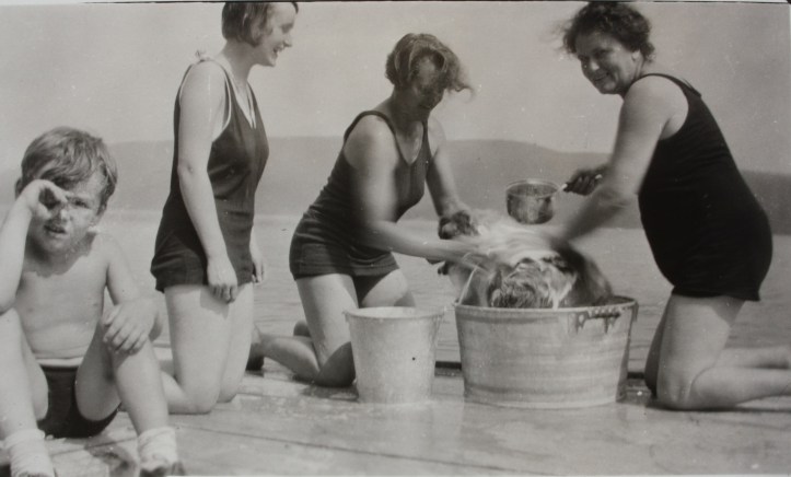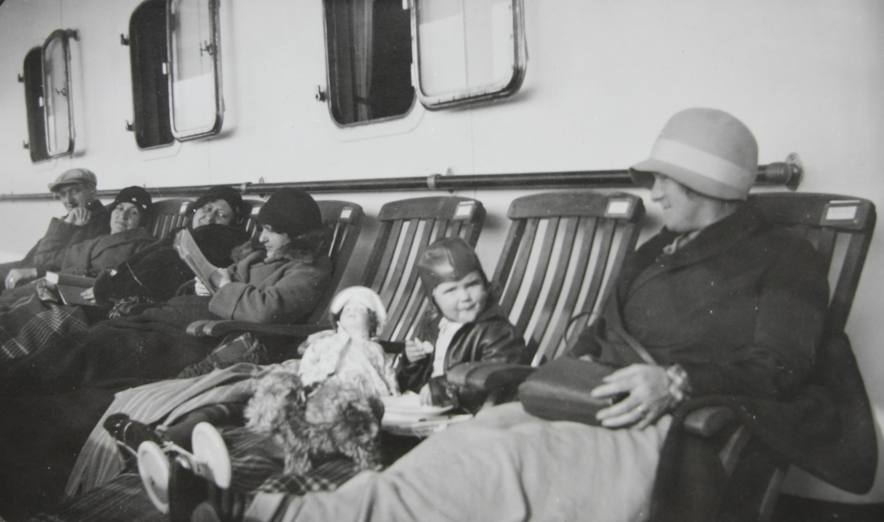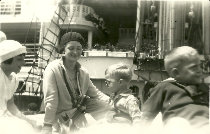 Das folgende Bild zeigt meine Tante auf einer Plattform zwischen einigen Kindern sitzend, die Beine seitlich abgewinkelt. Sie schaut lächelnd auf einen kleinen Jungen herunter. Gemeinsam vertreiben sie sich die Zeit, sie muss voller Erwartung gewesen sein, da können 11 Tage ganz schön lang sein. Ich mag dieses Bild von ihr sehr.