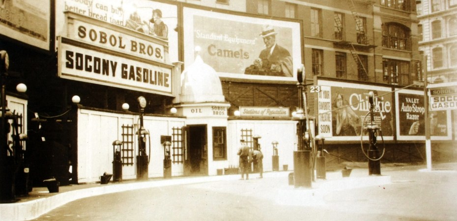 Auf der nächsten Seite ihres Albums sticht das Foto einer Tankstelle heraus.