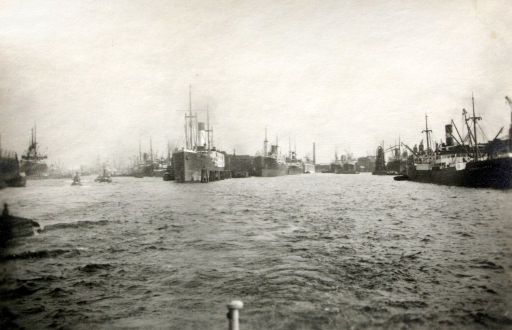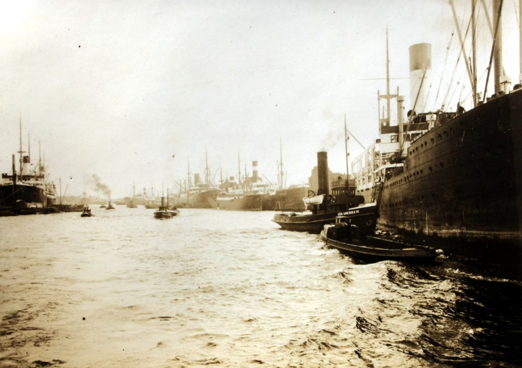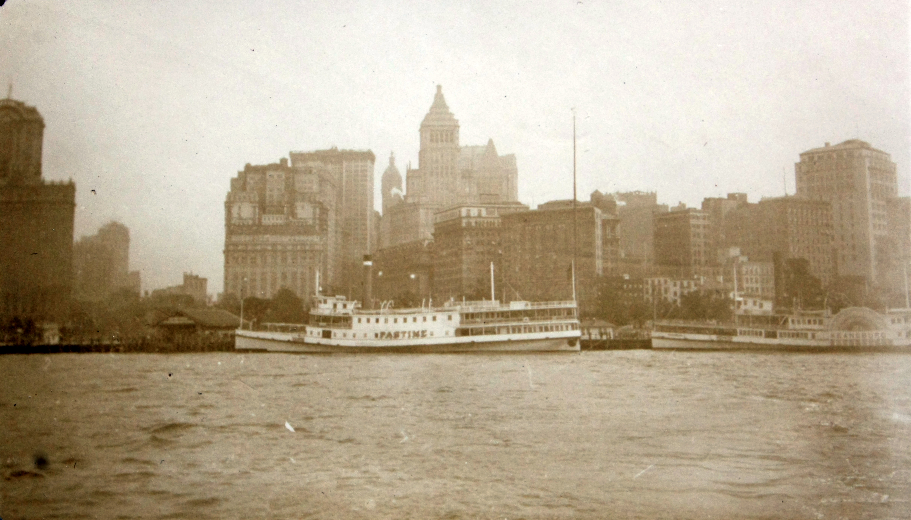 Und dann, endlich, die Einfahrt in den Hafen von New York, vorbei an der Freiheitsstatue. Rechts oben der Pier der Hapag, vermutlich der Ort, an dem sie an Land gingen.