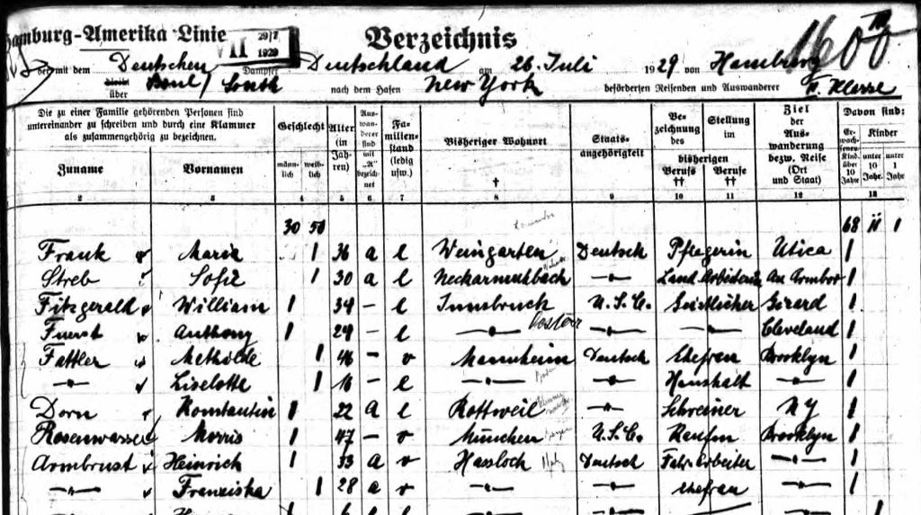 In der „Arrival List“ geben die beiden an, dass sie bei Mathildes Schwester unterkommen, ihr Name ist als H. O. Gauss angegeben und die Adresse: Brooklyn, NW. 483 Ocean Parkway. Hier fängt es übrigens an, entweder lächerlich oder beängstigend zu werden, wie die Namen in meinen Herkunftsfamilien sich wiederholen. Die Männer heißen August und Wilhelm, vielleicht auch noch Otto, die Frauen gerne Liselotte oder Marianne, aber dass jetzt die Tante meiner Mutter einen Herrn Gauss geheiratet hat, ebenso wie Großonkel Willi, also ein Verwandter der väterlichen Seite, eine Elisabeth Gauss heiratet, kann ich schwer integrieren.