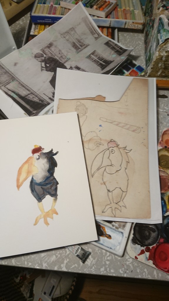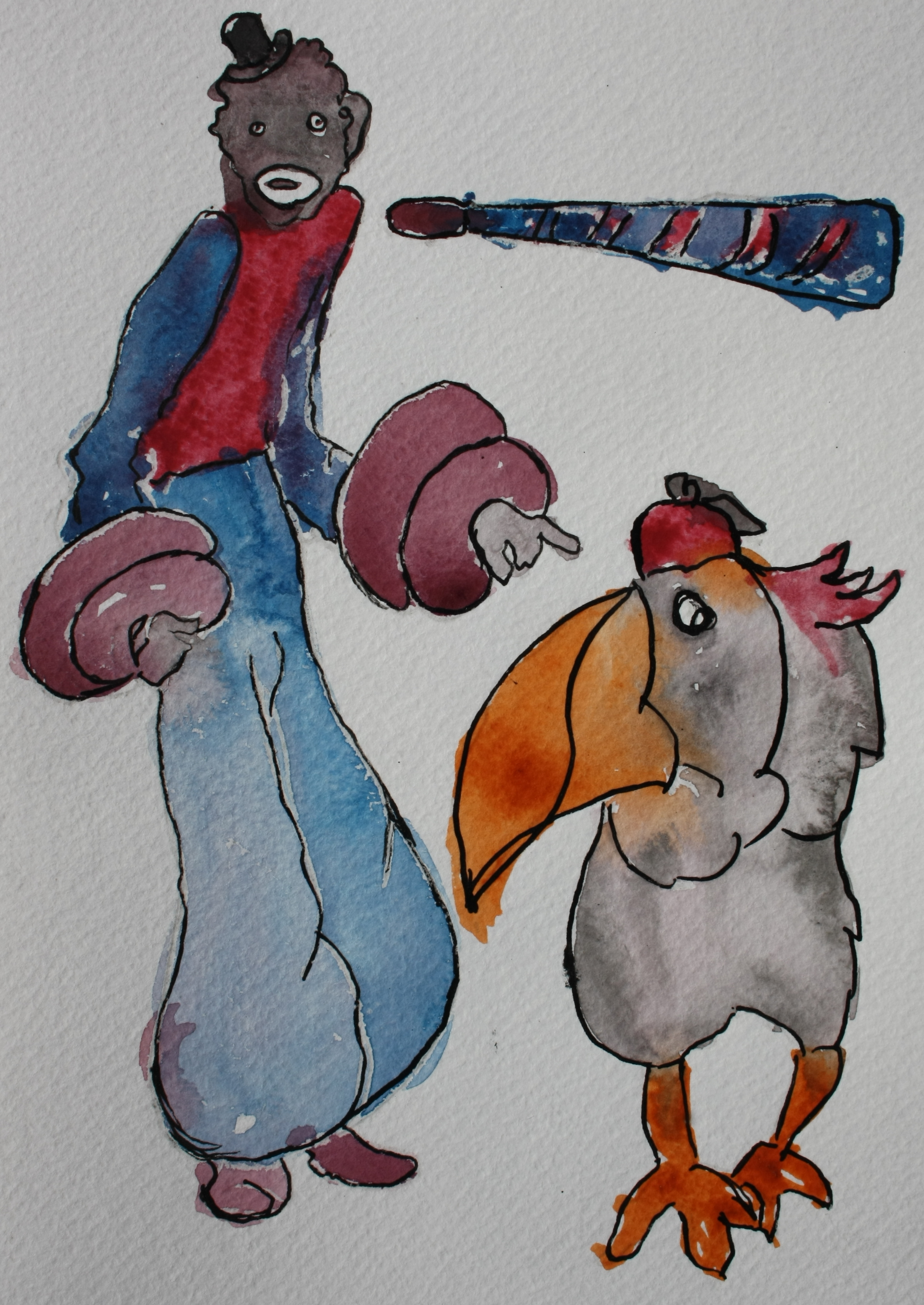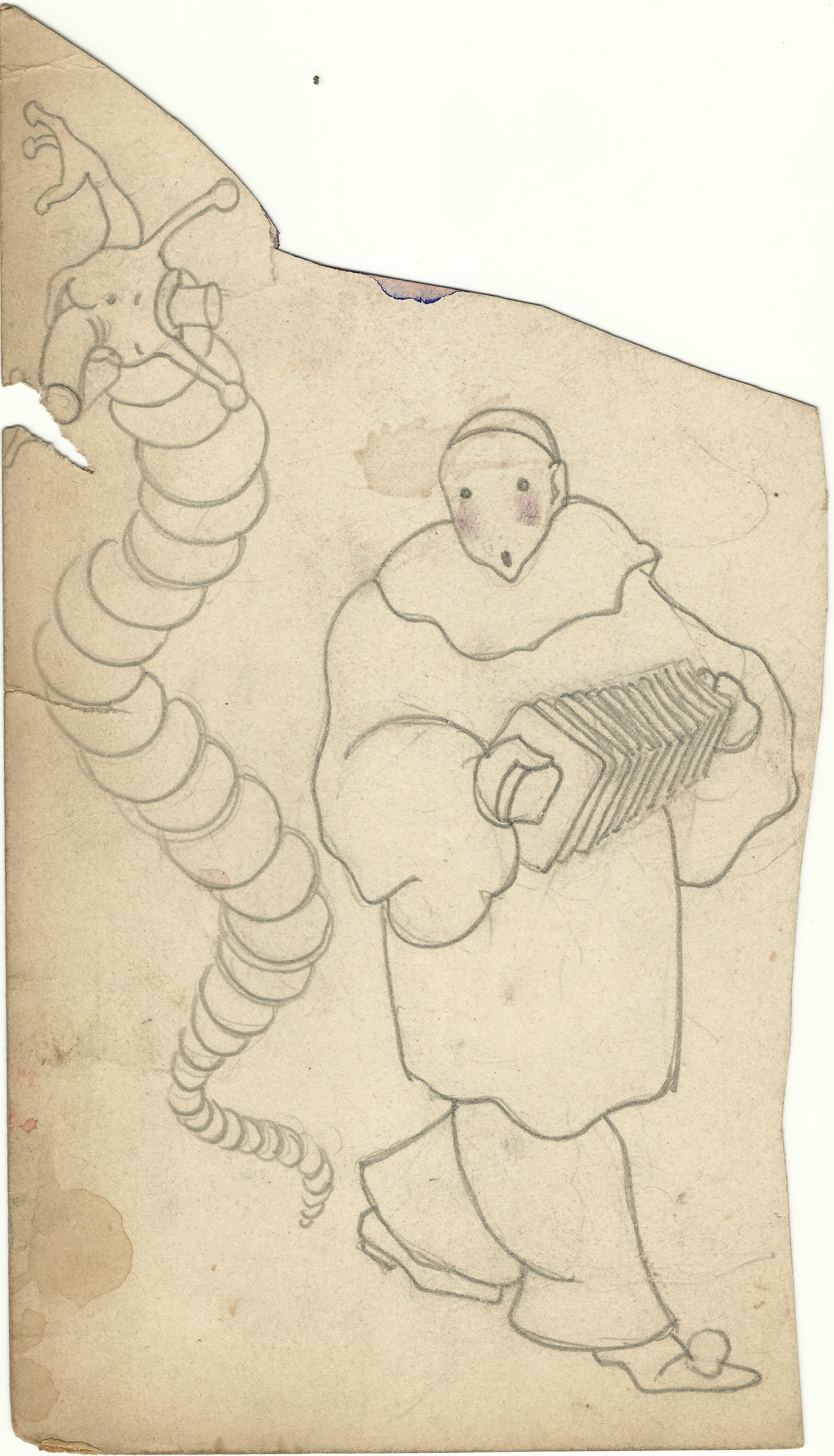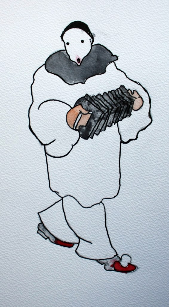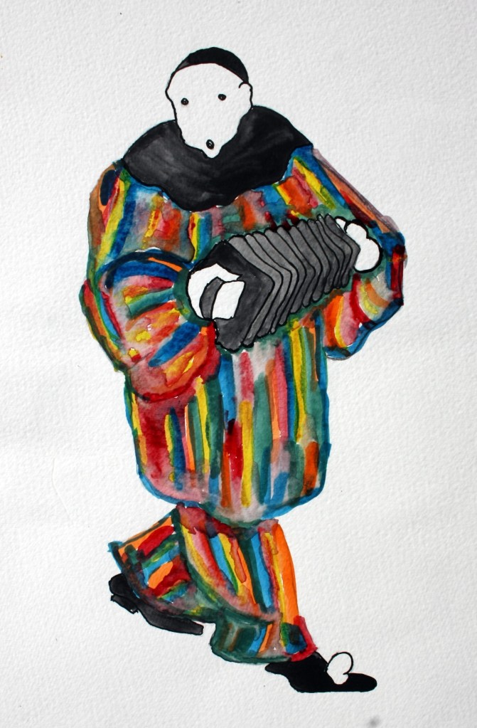 Wie schon erwähnt, wurde auch hier mir die Qualität seiner Zeichnung so richtig erst beim Nachzeichnen bewusst. Und erst wollte er gar nicht bunt werden, nur einen Tupfer rot am Schuh. Aber dann entstand die Verbindung zum Großen Finale und es brauchte noch eine weitere Version mit Dr. Sigismunds buntglänzenden Streifen. Statt der Trommel nun eine Quetschkommode (die natürlich zu dem Akkordeonspieler Willy viel besser passt), und statt dem Weglassen des Gesichts, mit dem ich meine Unfähigkeit, Gesichter zu zeichnen verborgen habe, haben wir jetzt hier die Maske des Pierrot.