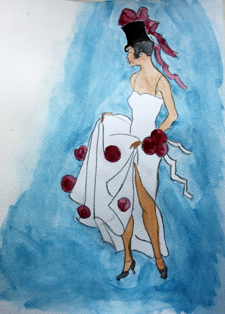 Beim Malen hier fielen die Groschen in einem ständigen Pling-Pling. Natürlich der Zylinder, aber das mit Rosen besetzte Kleid ist zweierlei: Es ist das Dornröschenkleid, das erst Eva und 2 oder 3 Jahre später dann ich als Faschingskleidchen hatten. Es hatte zwar ein Oberteil in rotem Samt, das hätte hier nicht gepasst, aber der Rock war aus einem fließendem, schwingenden weißen Stoff, besetzt mit roten Rosen. Weißes Tuch mit Rosenblättern ist natürlich auch das Bild meiner Schwester im Dritten Orden, wo die Pflegerinnen ihr mit weißen Laken bezogenes Totenbett mit roten Rosenblättern geschmückt hatten. Hier rettete mich beim Malen dann das lichte heilende Blau des Wassers.