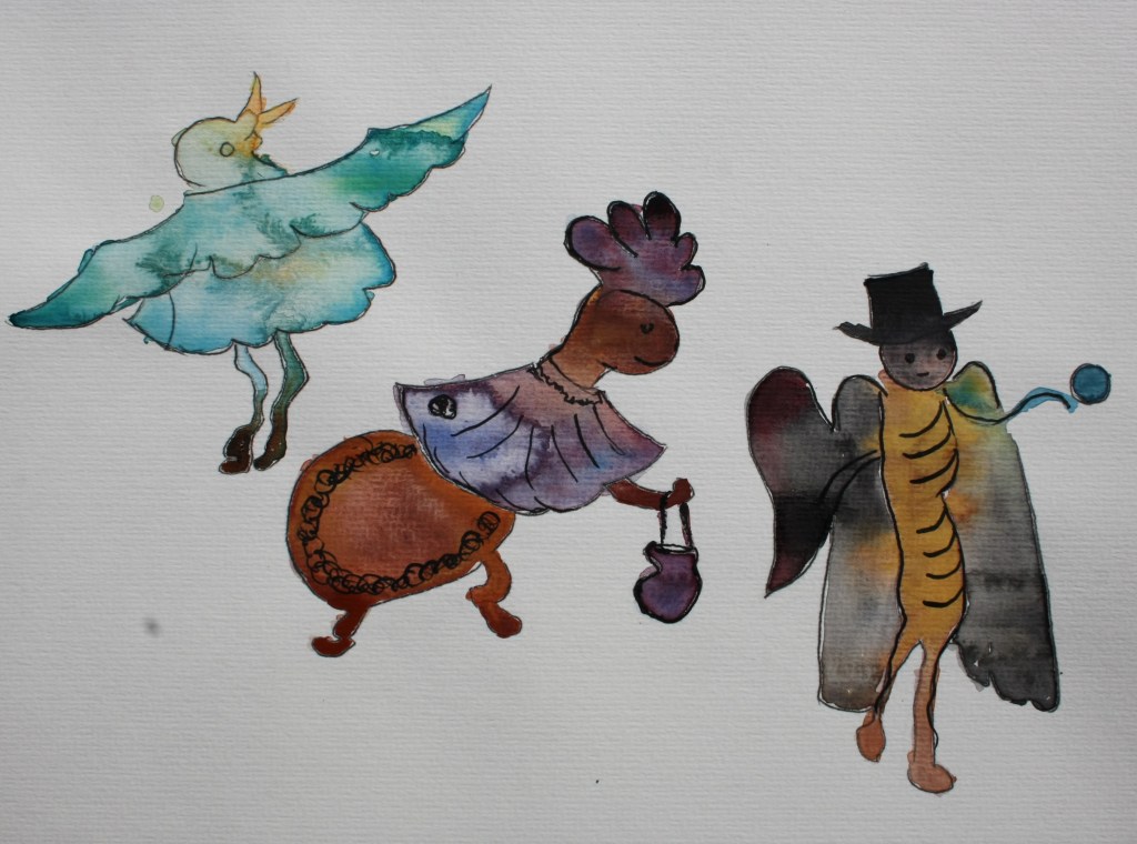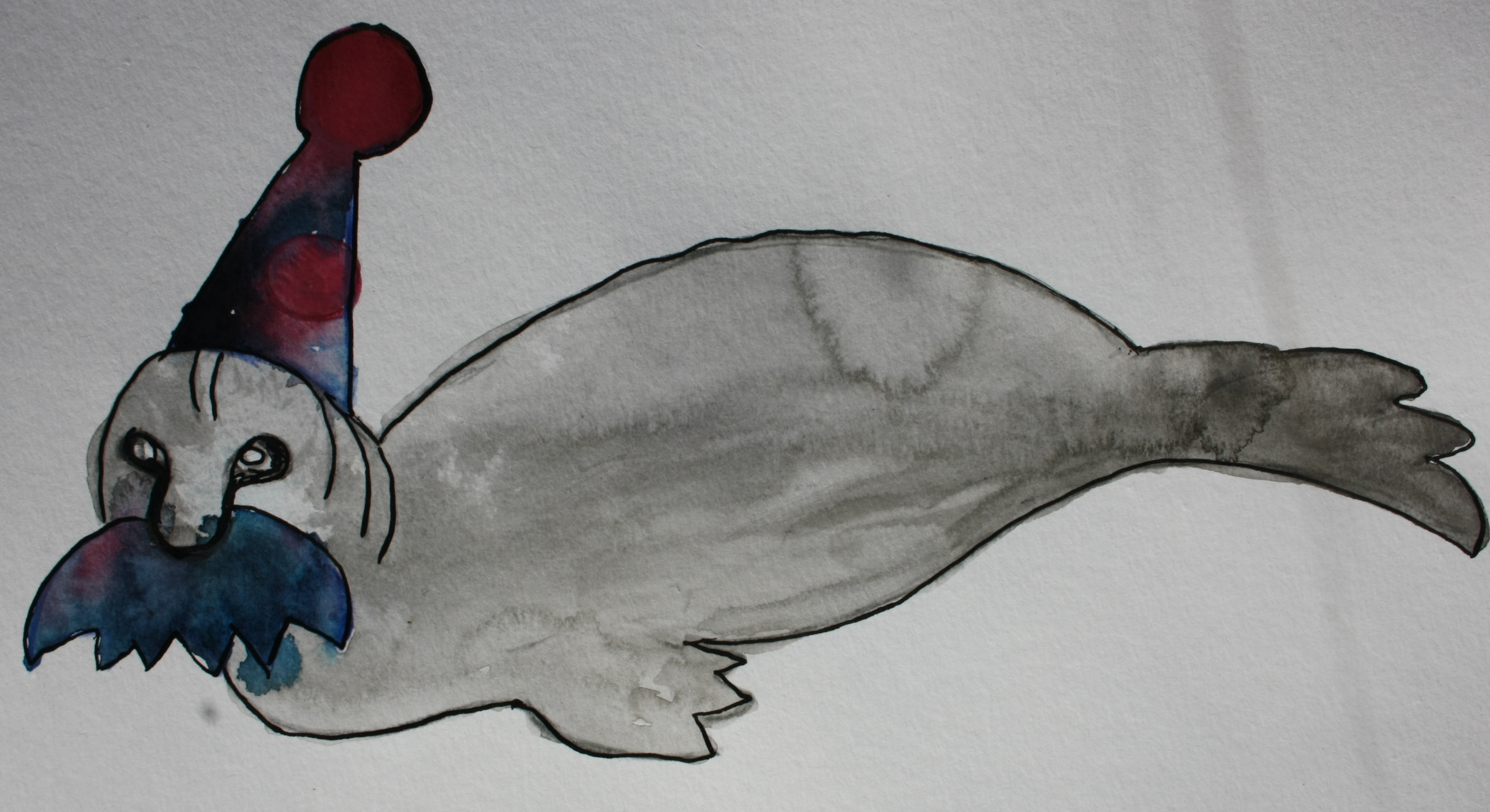 Zeichnungen mit schönen, eleganten Frauen, die eine trägt den Zylinder, der bei meinen Manege-Szenen eine zentrale Rolle spielt. Ein dünner Schwarzer mit überdimensionierten Puffärmeln und ein Ziehharmonika spielender Pierrot, daneben dann Tiere: eine Robbe, ein Nilpferd und ein Vogel, der – fast – von mir sein könnte und als erster Versuch auch gleich so leicht gelang wie danach kein Bild mehr.