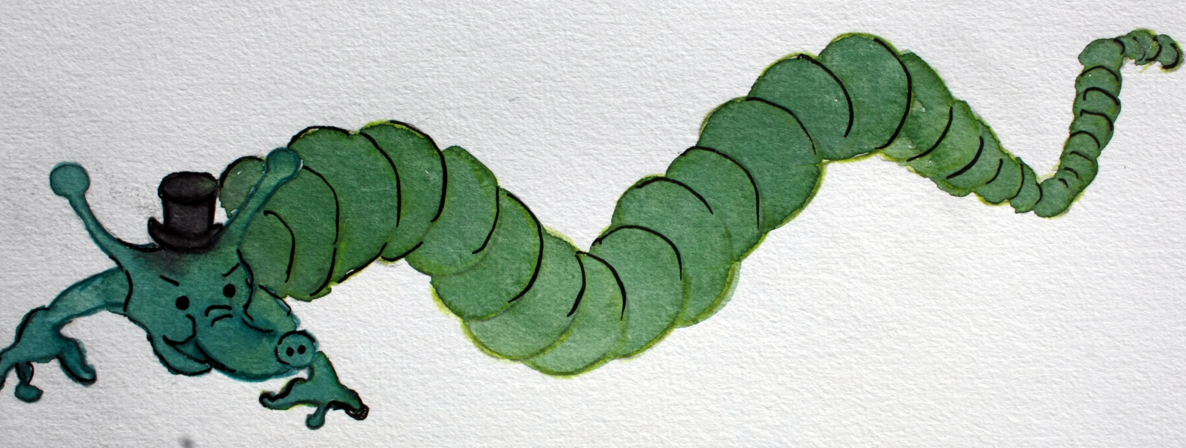 Manche Bilder gelingen, mit den meisten bin ich noch gar nicht zufrieden. Alleine mit Farbigkeit strahlen sie nicht unbedingt mehr; aber ich überlasse das Urteil hier mal euch. Den Wurm mag ich persönlich sehr gerne, er erinnert mich an einen Wurliwurm. Und jetzt fällt mir ein, wie mein Vater und ich einmal in München in der Fußgängerzone unterwegs waren, Kaufingerstraße meine ich. Da standen wir lange bei einem Straßenverkäufer, der virtuos einen orangenen Wurliwurm zum Leben erwecken konnte. Mein Vater hatte eine große Freude an der Geschicklichkeit des Mannes.
