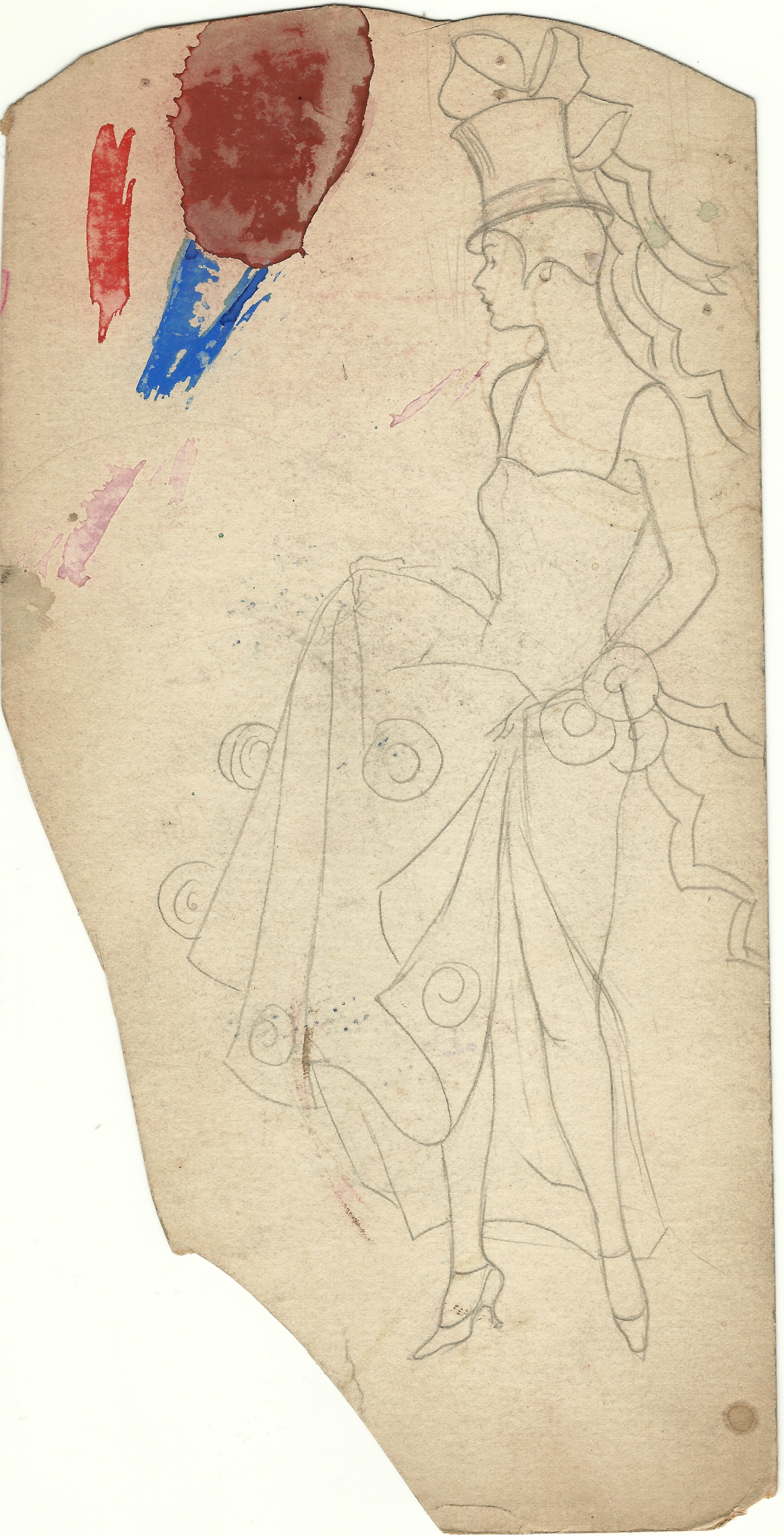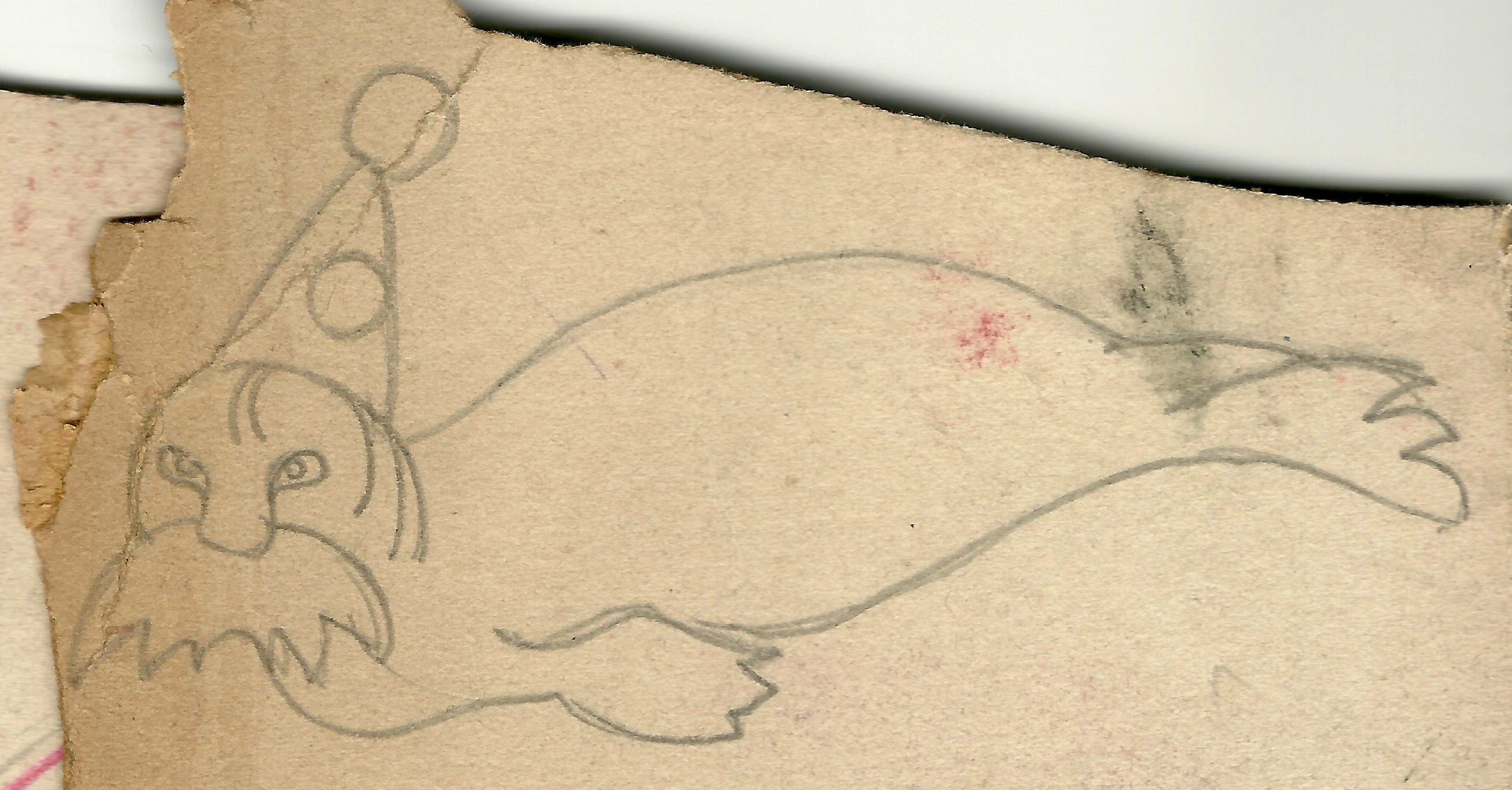 Die von mir so bezeichneten Zirkusbilder sind Zeichnungen auf festem Karton – Babbadeckel möchte ich gut münchnerisch sagen -, an einer Stelle ist „5 Fenster“ notiert, was uns auf die Idee brachte, dass Willy plante, die Zeichnungen auszuschneiden und wie auf einer Bühne zu arrangieren und aufzustellen.