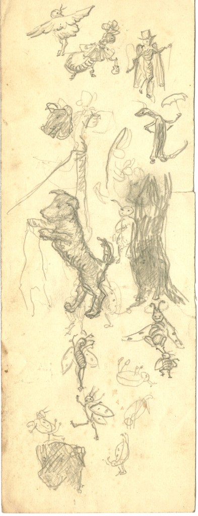 In Willys Bildermappe befand sich dieses kleine Kärtchen mit Zeichnungen. Erst habe ich nur das süße Hundchen gesehen – das gefällt bestimmt meiner Freundin, die grade auch ein kleines Hundchen hat, dachte ich und die vielen anderen Figürchen habe ich erst gesehen, als ich die Karte eingescannt habe.