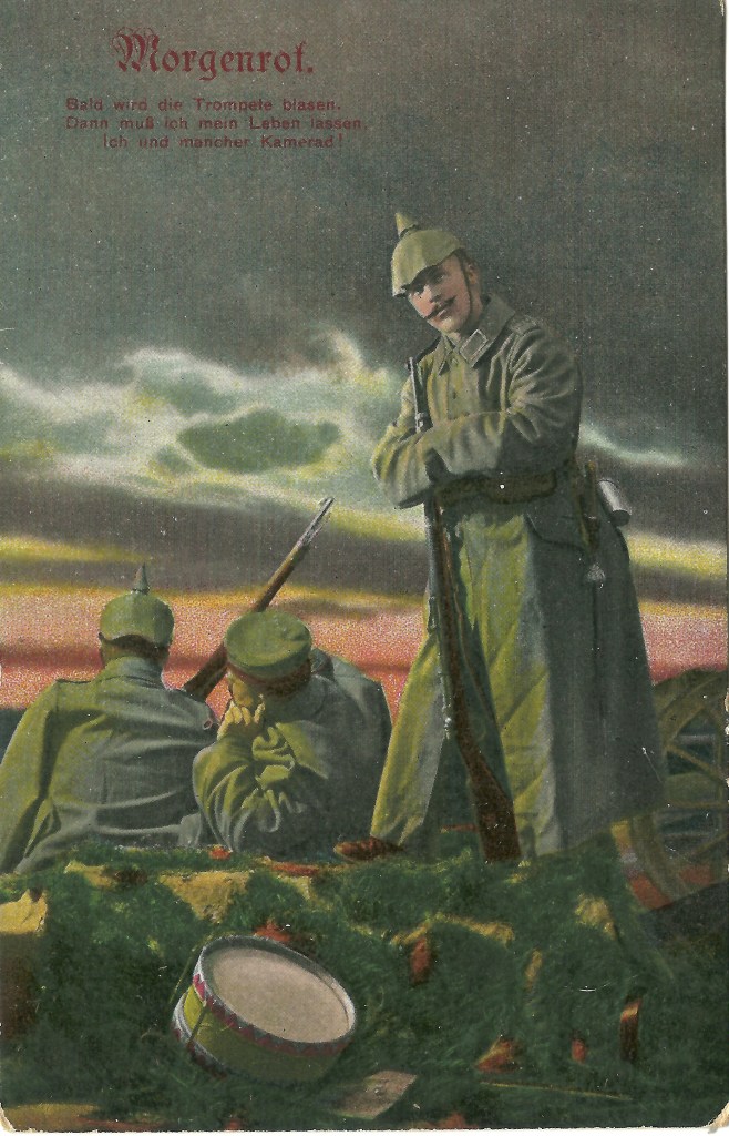 Vom März 1917 gibt es diese Postkarte mit dem Titel „Morgenrot“ und dem Text „Bald wird die Trompete blasen. Dann muß ich mein Leben lassen. Ich und mancher Kamerad!“.