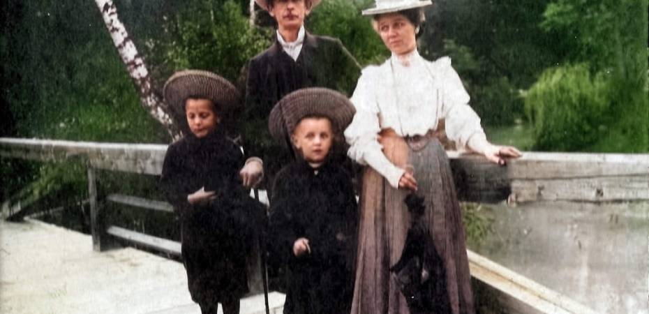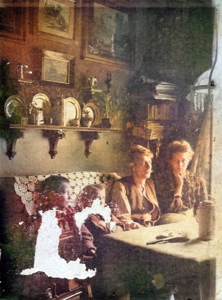 Jetzt fällt es mir auf, weil es mittig an allen vier Seiten rostige Druckstellen von Reißnägeln hat; es war also mal ein wichtiges Foto, das jemand an die Wand gepinnt hat, damit er oder sie es jederzeit sehen konnte. Umdrehen hilft manchmal, dort steht: „Gewidmet zum dauernden Andenken der Familie Weidemann München im August 1906 Innsbruck 1906„. Auch hier hat mir der FB-Kollege geholfen mit einer schönen Kolorierung.