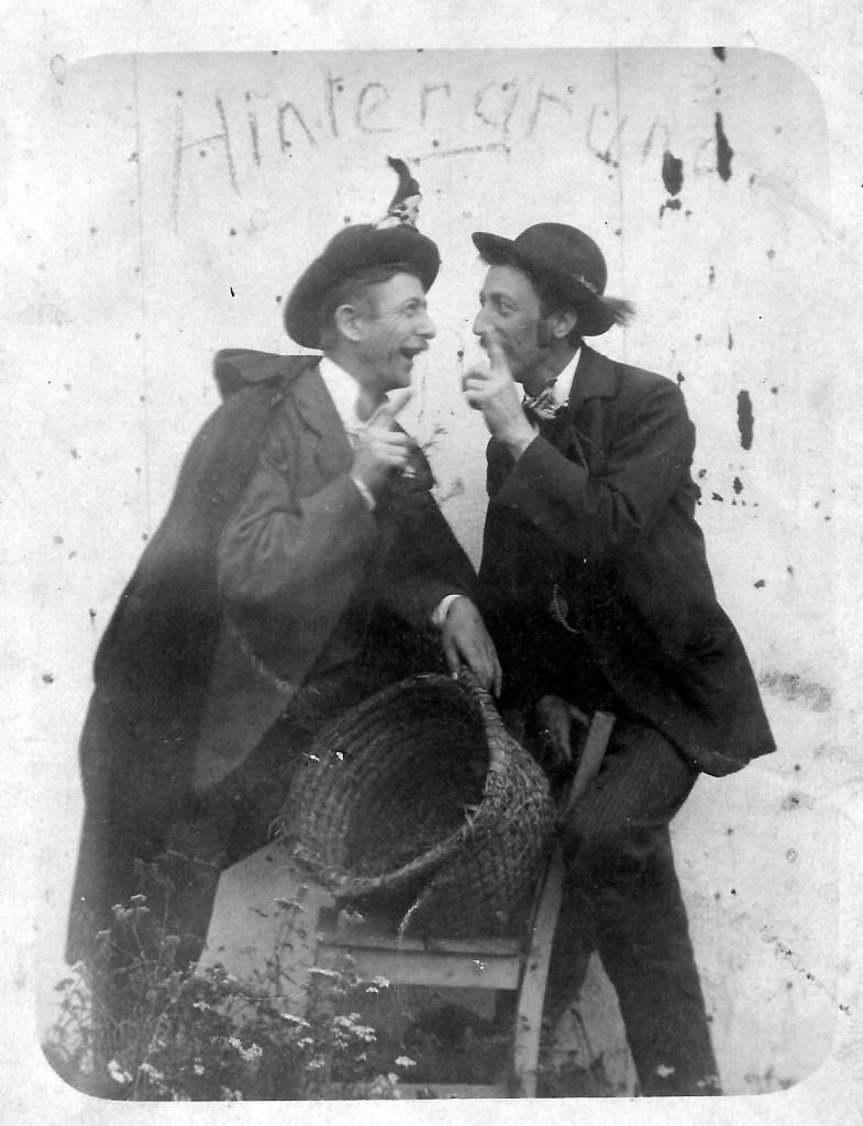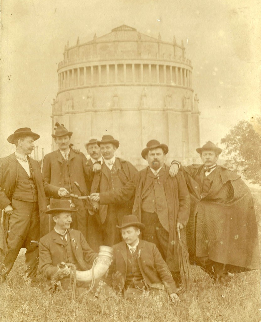 Links sind definitiv zwei Spaßvögel am Werk, den Witz, den sie uns erzählen wollen, kennen wir leider nicht; aber den Hintergrund mit „Hintergrund“ zu betiteln hat schon was. Das rechte Bild ist mir ein bleibendes Rätsel. Immerhin habe ich herausgefunden, dass die gemischte Herrenrunde sich vor der Befreiungshalle in Kelheim versammelt hat und wir finden Wilhelm vorne links, der sich schon mal das Trinkhorn gesichert hat.