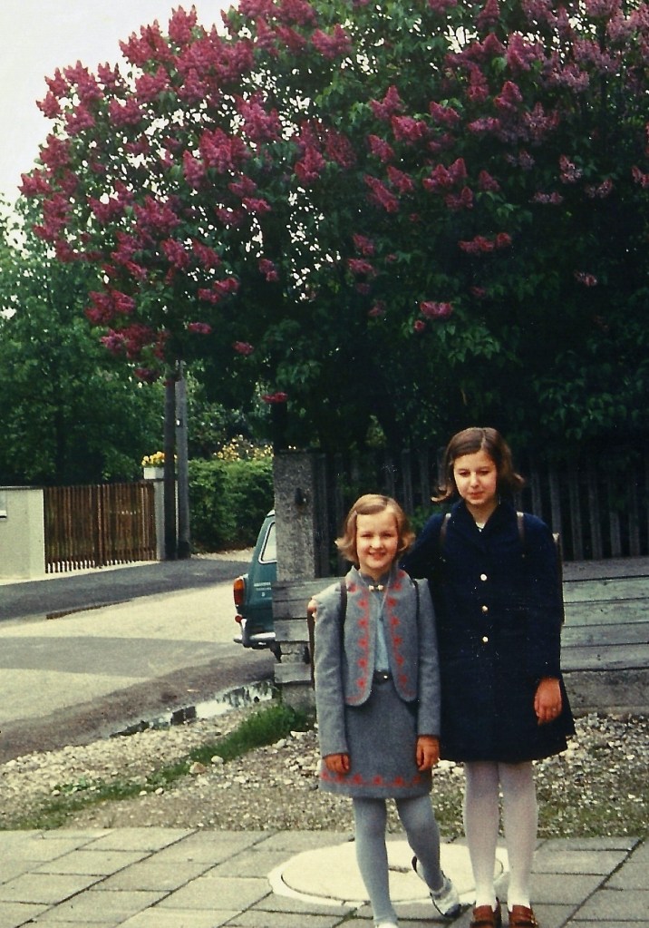 Ich in meinem grauen Kommunionskostüm, das meine Mutter ausgewählt hatte, damit ich mich von den weißgekleideten, unschuldigen Mädchen abhebe, etwas irritiert von dem Arm, den meine Schwester Evi um mich gelegt hat, das war sonst nicht so ihre Art. Die Straße ist ein Flickenteppich aus Teer in verschiedenen Grautönen, der Gehweg Kies mit Pfützen und wir stehen direkt vor dem Gulli, dessen Leerung – einmal im Jahr? – ein großes, stinkendes Ereignis war. Es gab also bis in die 70er Jahre in Obermenzing weder ein Trottoir noch eine Kanalisation.