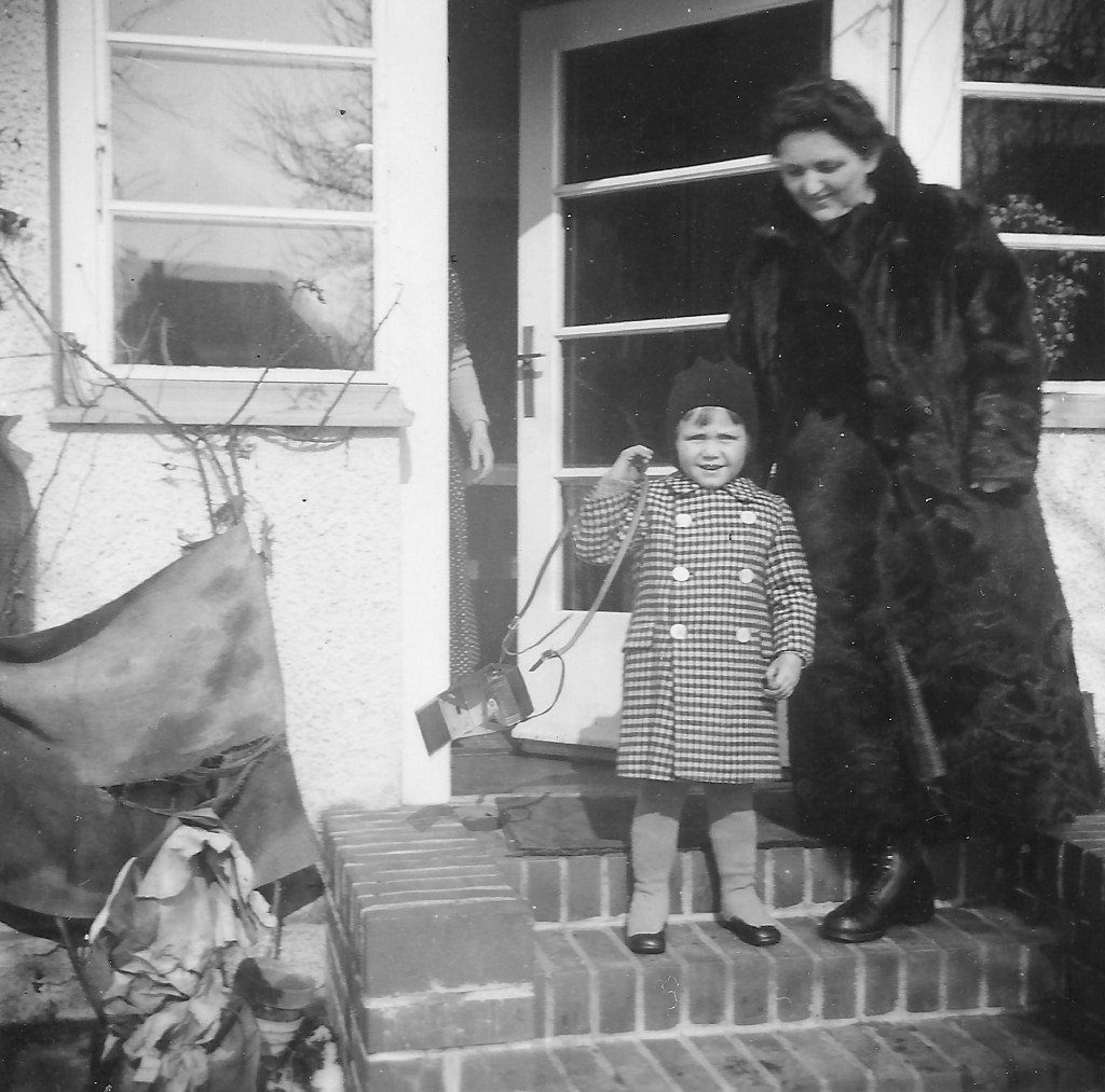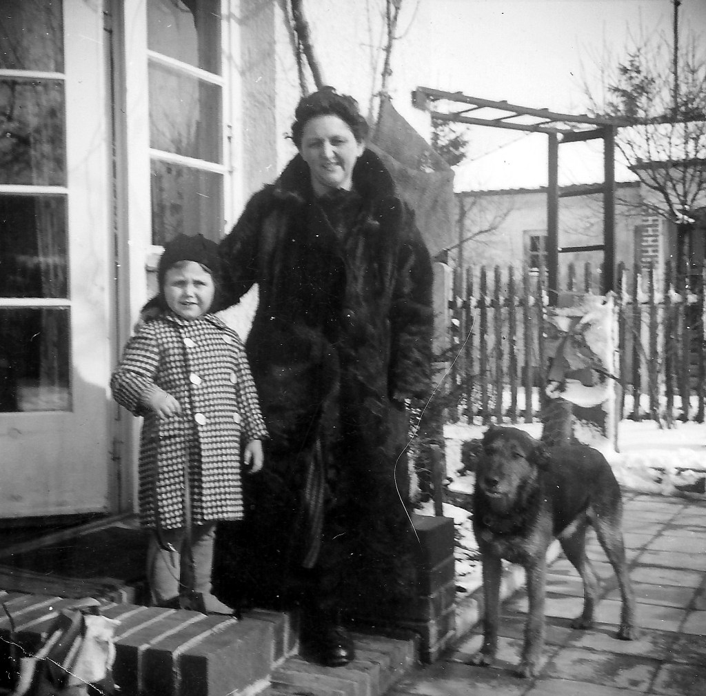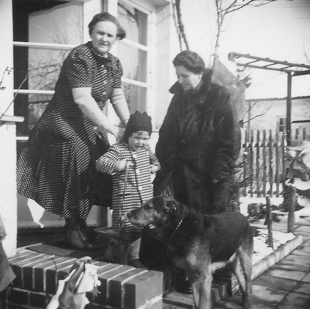 Peterle hat die Tasche vom Fotoapparat erobert und dann kommt auch noch die Oma Annie schnell kurzärmelig in die Kälte, um ihm den Kragen zu richten, das gefällt ihm offensichtlich nicht. Vielleicht trägt er das neue Mäntelchen, von dem Luise geschrieben hat. Das letzte Bild dürfte dann das mit der geplanten Aufstellung sein. Otti hat anscheinend gerne den Moment eingefangen und wollte sie nicht nur zeigen, wenn sie sich fertiggerichtet hatten. Luise trägt einen schweren, schwarzen Pelzmantel, ich trug so einen in meinen Heidelberger Studentenzeiten, bevor ich realisierte, dass das Wetter dort deutlich milder war als in München und ich immer nassgeschwitzt war, wenn ich die Höhen des Emmertsgrunds erklommen hatte. Wegen der Länge und der Schwärze habe ich immer gedacht, ich hätte ihn von Oma Jaja geerbt, aber wenn ich jetzt die Fotos so betrachte, könnte es auch dieser gewesen sein.