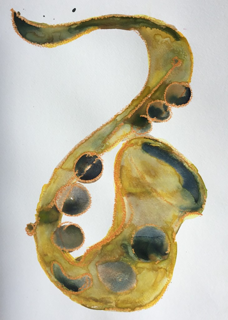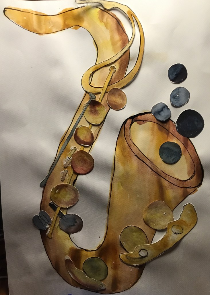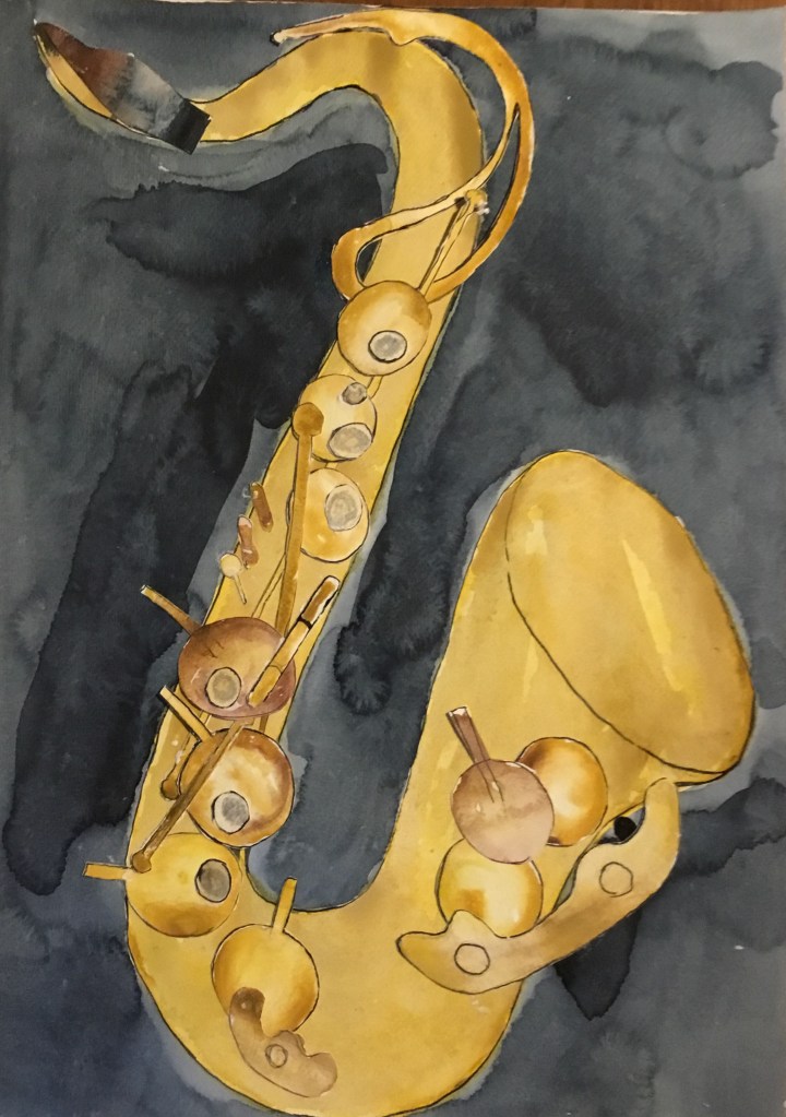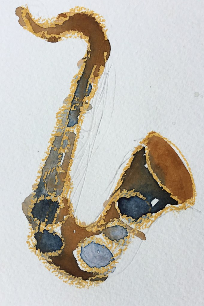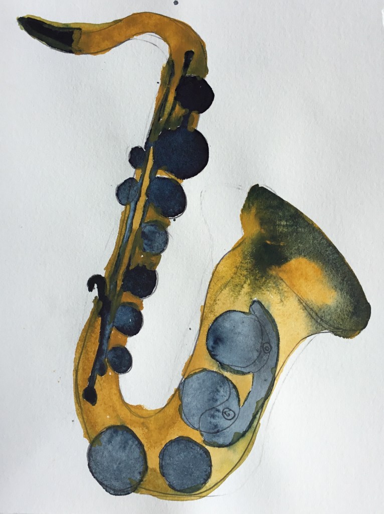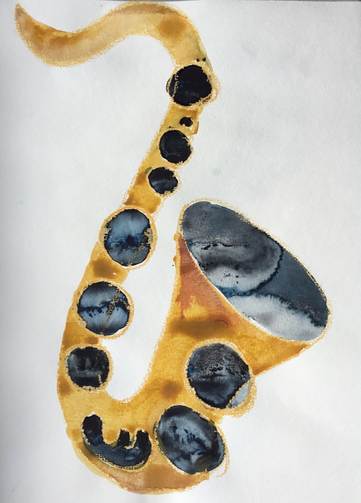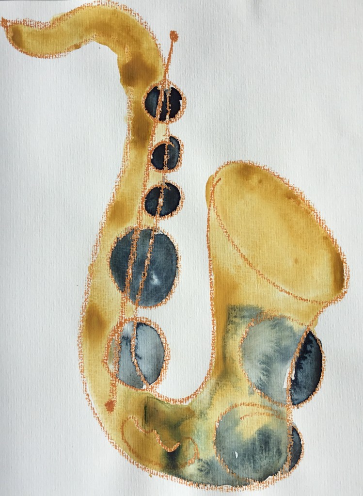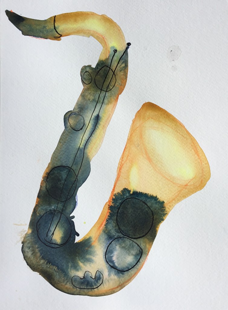 Ich kann auch Serie! Beziehungsweise bleibt mir nix anderes übrig, weil die Bilder ja schnelle Würfe sein wollen. Jedenfalls bisher, das könnte sich ändern, wenn ich im Radierkurs voranschreite, das erfordert auf einmal Genauigkeit und Präzision statt einfach aus dem Pinselbecher drauf los schütten. Mehrere Versuche, bis eine Version dabei ist, mit der ich mich anfreunden kann, gibt es öfters, aber so stur wie bei den Saxophonen war ich vorher noch nie. Die verschiedenen Blättern zeigen den Prozess, dem Thema Herr zu werden, und das geht direkt parallel zum gleichzeitigen Versuch, das Instrument selbst zu erobern. Einen Schritt weiter bin ich mit diesen Bildern wirklich gekommen, weil durch das Malen die Vorstellung von den Klappen, Gestängen und Räumen klarer wurde und ich ein besseres Verständnis dafür bekommen habe, wie das Saxophon sich für mich greift; nicht umsonst heißt das letzte Bild, also das mit dem ich rundum zufrieden bin: „Wie mein Saxophon sich anfühlt, wenn ich das B anders greifen soll als ich es gewohnt bin“.
