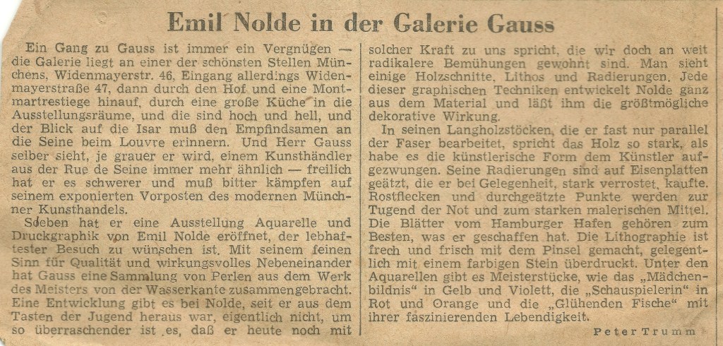 Soeben hat er eine Ausstellung Aquarelle und Druckgraphik von Emil Nolde eröffnet, der lebhaftester Besuch zu wünschen ist. Mit seinem feinen Sinn für Qualität und wirkungsvolles Nebeneinander hat Gauss eine Sammlung von Perlen aus dem Werk des Meisters von der Wasserkante zusammengebracht. Eine Entwicklung gibt es bei Nolde, seit er aus dem Tasten der Jugend heraus war, eigentlich nicht, um so überraschender ist es, daß er heute noch mit solcher Kraft zu uns spricht, die wir doch an weit radikalere Bemühungen gewohnt sind. Man sieht einige Holzschnitte, Lithos und Radierungen. Jede dieser graphischen Techniken entwickelt Nolde ganz aus dem Material und läßt ihm die größtmögliche dekorative Wirkung.
