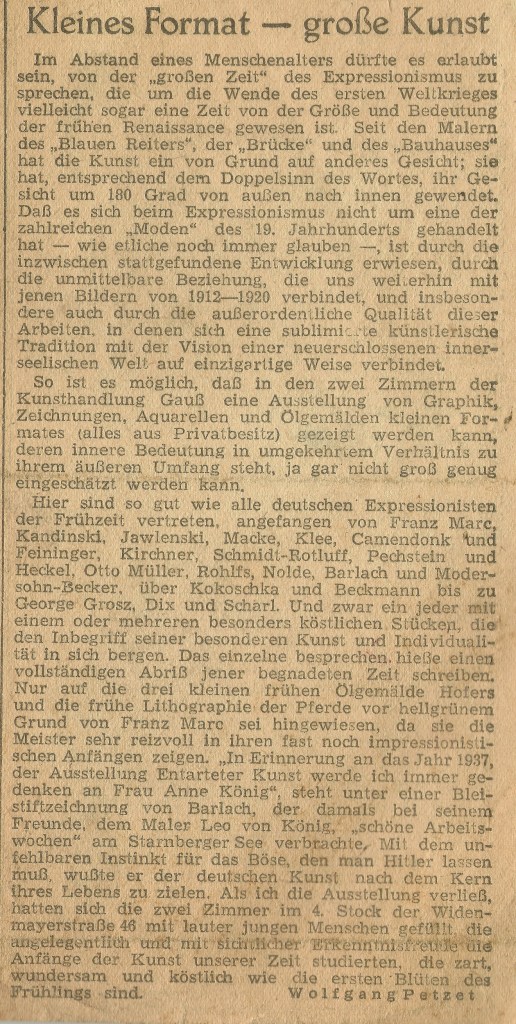So ist es möglich, daß in den zwei Zimmern der Kunsthandlung Gauß eine Ausstellung von Graphik, Zeichnungen, Aquarellen und Ölgemälden kleinen Formates (alles aus Privatbesitz) gezeigt werden kann, deren innere Bedeutung in umgekehrtem Verhältnis zu ihrem äußeren Umfang steht, ja gar nicht groß genug eingeschätzt werden kann.
