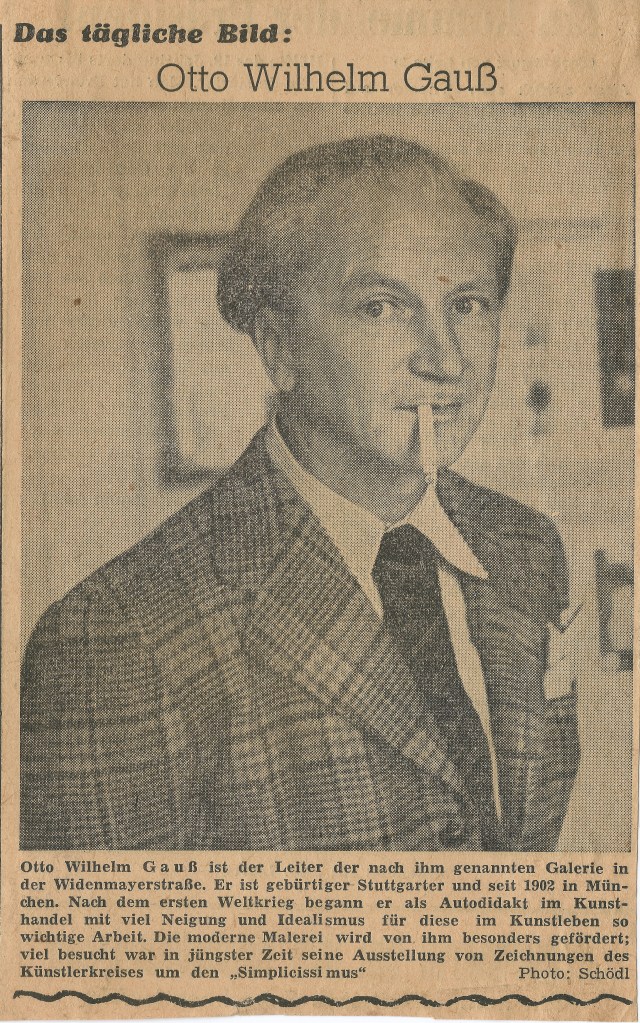 Otto Wilhelm Gauß ist der Leiter der nach ihm genannten Galerie in der Widenmayerstraße. er ist gebürtiger Stuttgarter und seit 1902 in München. Nach dem ersten Weltkrieg begann er als Autodidakt im Kunsthandel mit viel Neigung und Idealismus für diese im Kunstleben so wichtige Arbeit. Die moderne Malerei wird von ihm besonders gefördert; viel besucht war in jüngster Zeit seine Ausstellung von Zeichnungen des Künstlerkreises um den „Simplicissimus“.