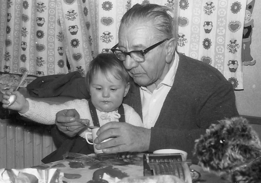 Das ist eines meiner Lieblingsbilder: Opa Gustl mit der kleinen Steffi, also mit mir, in der Küche des Karwinkel. Seine ruhige, zugewandte Konzentration beim Kakao-füttern und ich, bereitwillig auf den Kaba wartend, den eroberten eigenen Löffel fest in die kleine Faust gepackt. Den Vorhang gibt es übrigens noch, der kommt in meine eigene Küche, wenn sie denn mal renoviert wird.